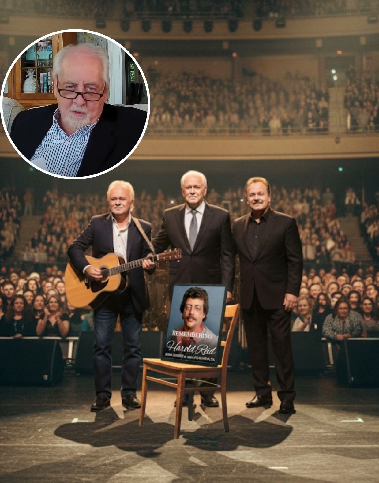 The night began quietly, almost reverently. There were no grand introductions, no fireworks, no spectacle — just three men stepping onto the stage where memory itself seemed to take a seat beside them. Behind them glimmered an image of Harold Reid, the bass voice who had once been the heartbeat of their harmonies. His presence lingered, not as a ghost, but as a grounding spirit — the unspoken fourth voice that had shaped every chord they ever sang.