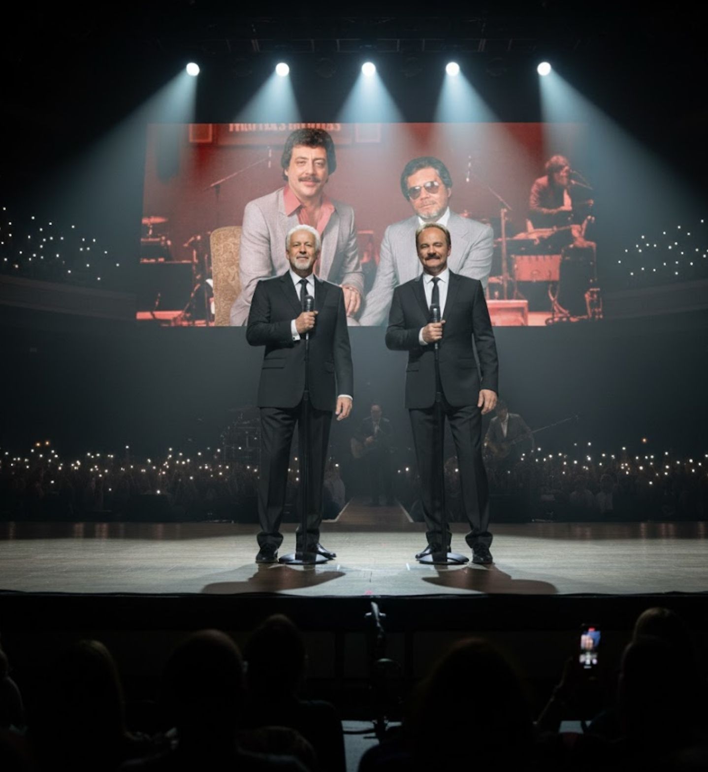 At the center of the stage stood Jimmy Fortune and Don Reid — not just performers, not just surviving members of The Statler Brothers, but brothers in every way that mattered. Brothers in song. Brothers in life. Brothers forever tied to the men whose faces glowed on the screen above them.